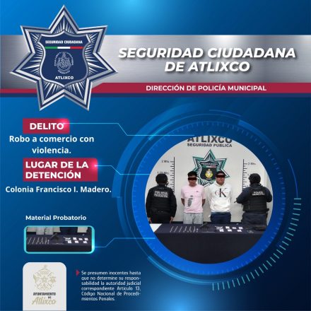Leer más: SSC DETIENEN A DOS HOMBRES POR AMENAZAS Y PORTACIÓN ILEGAL DE ARMA DE FUEGO EN ATLIXCO