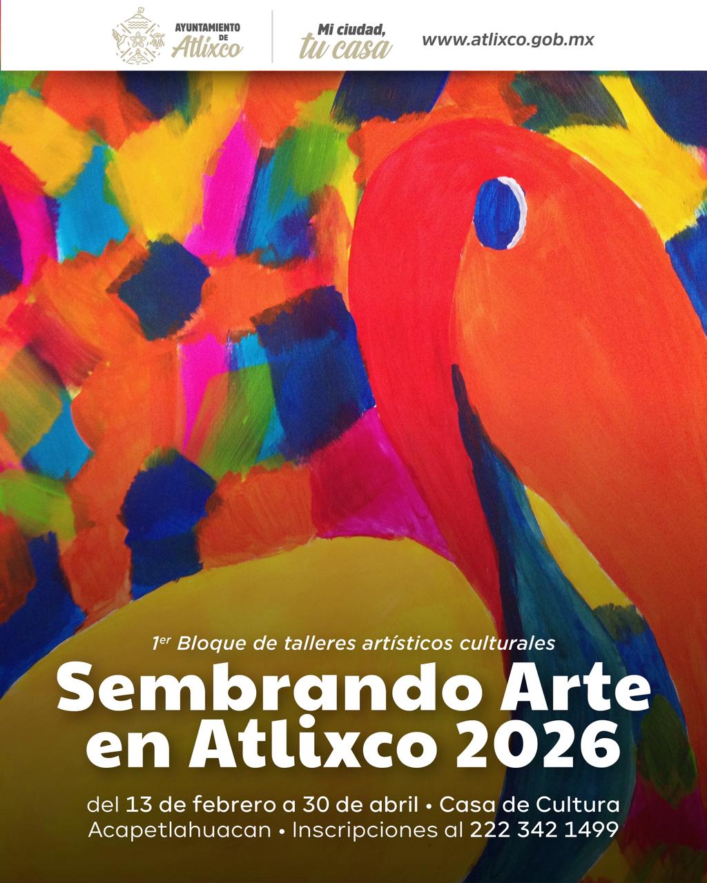La presidenta de Atlixco, Ariadna Ayala invita a la ciudadanía a participar en el Primer Bloque de Talleres Artísticos y Culturales “Sembrando Arte en Atlixco 2026”, que se realizará del todo el mes de febrero hasta el 30 de abril de 2026 en la Casa de Cultura de Atlixco “Acapetlahuacan”, con el objetivo de impulsar la creatividad, el aprendizaje y la participación cultural.