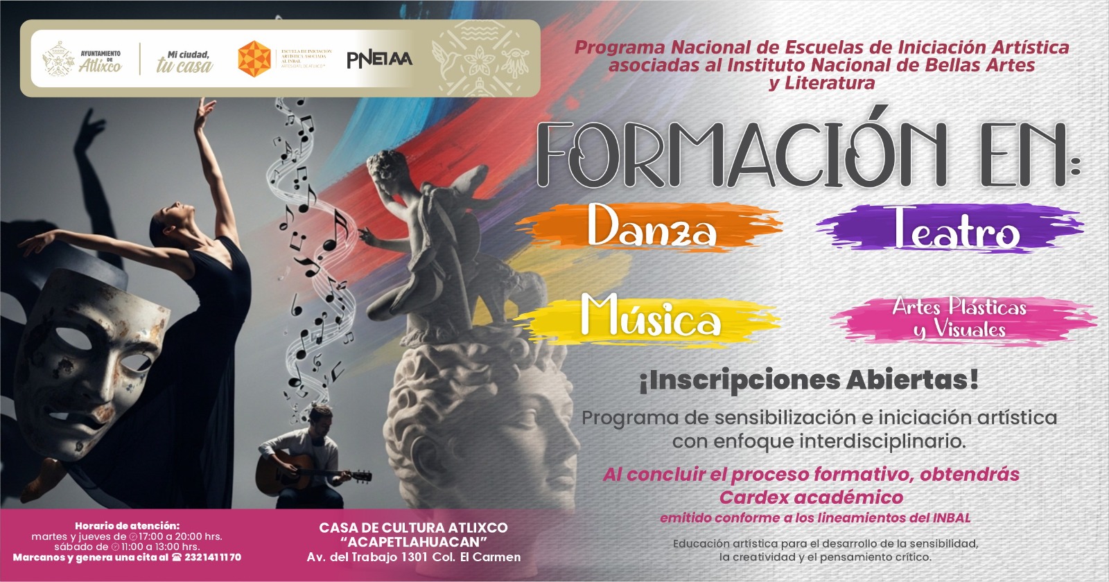 Las inscripciones se realizan en la Casa de Cultura Atlixco “Acapetlahuacan”, ubicada en Avenida del Trabajo 1301, colonia El Carmen en un horario de atención de martes y jueves de 17:00 a 20:00 horas, y sábados de 11:00 a 13:00 horas. Para mayores informes los interesados pueden llamar al 232 141 1170.