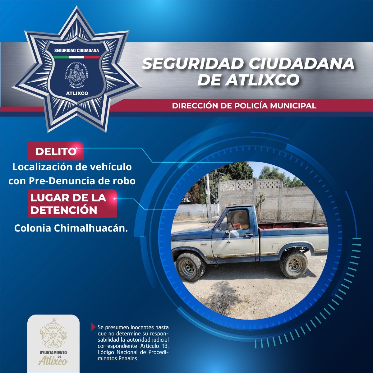 Durante recorridos de vigilancia en la colonia Chimalhuacán, la Secretaría de Seguridad Ciudadana de Atlixco, en coordinación con la Policía Estatal Preventiva, localizó una camioneta Ford F-150, modelo 1980, abandonada en el Camino a San José Recreo.