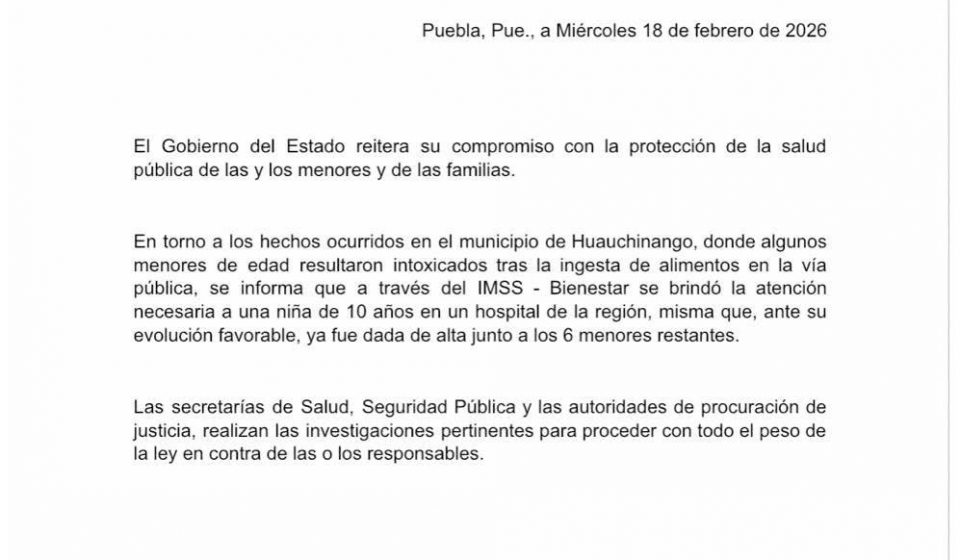 En torno a los hechos ocurridos en el municipio de Huauchinango, donde algunos menores de edad resultaron intoxicados tras la ingesta de alimentos en la vía pública, se informa que a través del IMSS – Bienestar se brindó la atención necesaria a una niña de 10 años en un hospital de la región, misma que, ante su evolución favorable, ya fue dada de alta junto a los 6 menores restantes.
