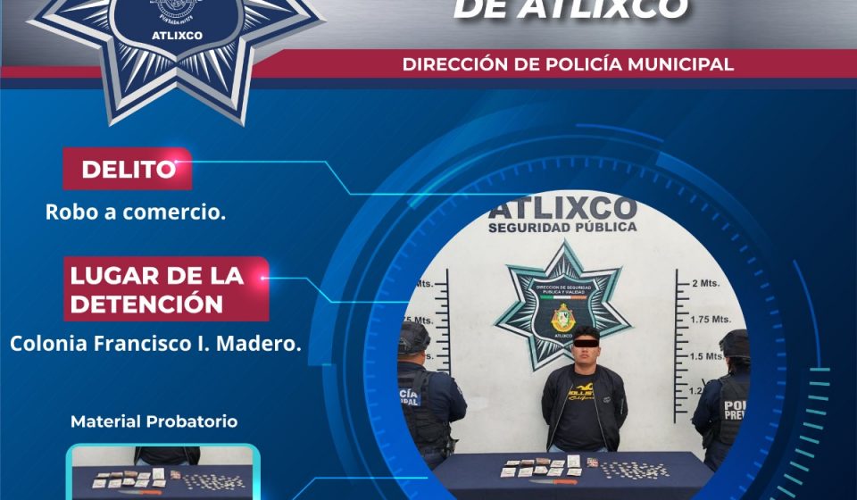 Elementos de la Policía de Atlixco detuvieron a un masculino por su probable responsabilidad en el delito de robo a comercio, tras un reporte ciudadano en la colonia Francisco I. Madero.