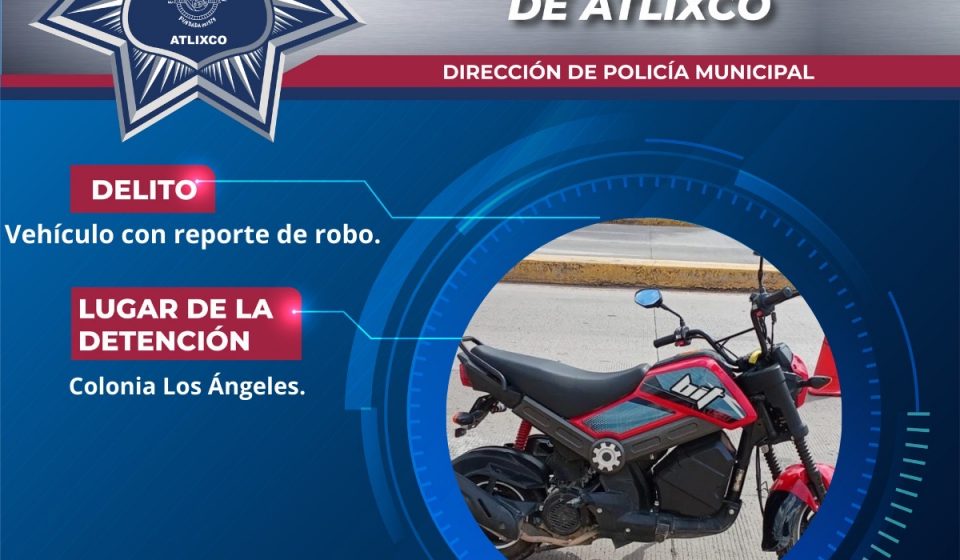 Elementos de la Policía de Atlixco recuperaron una motocicleta con reporte de robo durante labores de vigilancia en la colonia Revolución, tras atender un reporte emitido al número de emergencias 911.